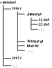 Because each file-such as calendar/1996/January/22.dat for January 22, 1996-has events for only one day, storing the information can be done using the same database tricks shown in previous chapters-use a flat text file for the database file, one record per line, with individual fields separated by a delimeter.