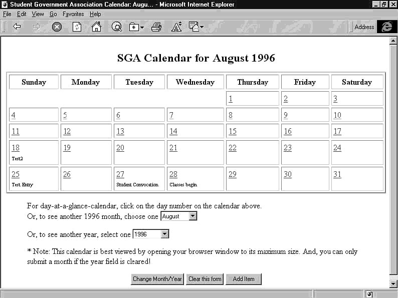 While the code in listing 22.4 only displays the time and description of each event, you can get as fancy as you want with your pages. For example, if you are letting users submit their own events to the calendar, you may want to display the name of the poster as well (see figure 22.4).