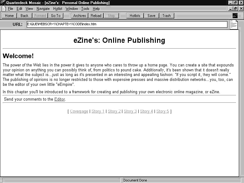 Copying this code block into each article file makes the entire site capable of being browsed without frames and retains the scripting functions so that status bar messages or anything else works properly. Any additional scripting tricks that you want to make available to frameless mode need only be wrapped with a check for "parent.TOC." Listing 24.5 places the eZines at the top of the cover page. It normally is in the Title frame.