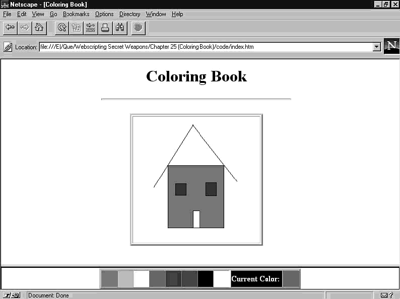 The SetColor() function in the onClick handler is a user-defined JavaScript function that stores the current drawing color in a global variable. It's demonstrated in the coloring book code on the companion CD-ROM. |