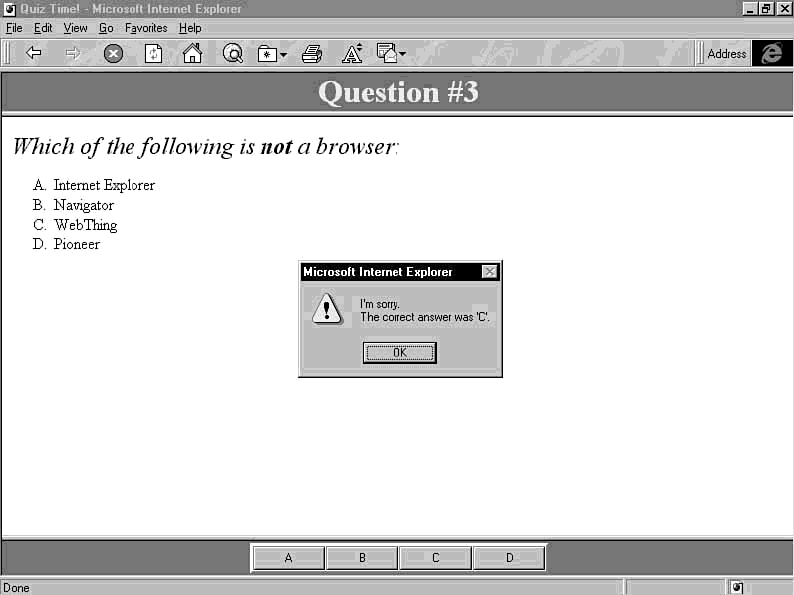 When the user clicks one of the answer buttons, which are formatted by the HTML source in listing 26.4, the Answer() function is fired.