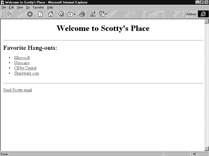 <HTML> <HEAD> <TITLE>Welcome to Scotty's Place</TITLE> </HEAD> <BODY BGCOLOR=#ffffff> <CENTER> <H1>Welcome to Scotty's Place</H1> </CENTER> <HR> <H2>Favorite Hang-outs:</H2> <UL> <LI><A HREF="http://www.microsoft.com/">Microsoft</A></LI> <LI><A HREF="http://home.netscape.com/">Netscape</A></LI> <LI><A HREF="http://www.cnet.com/">C|Net Central</A></LI> <LI><A HREF="http://www.shareware.com/">Shareware.com</A></LI> </UL> <HR> <A HREF="mailto:sjwalter@visi.com">Send Scotty email</A> </BODY> </HTML>