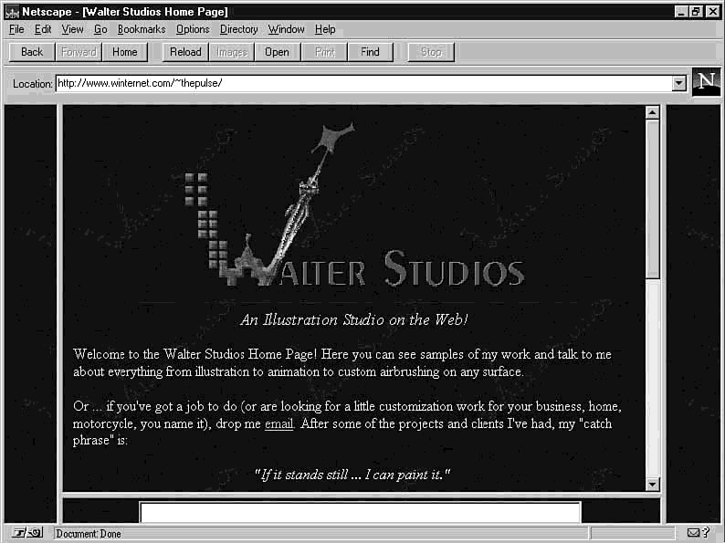 The logo graphic in the center of the screen is actually two separate image files. The final image with a splash of paint spraying from the tip of the airbrush, and the LOWSRC image without the paint spray. Other than that, the images are identical. Link to this site and the logo displays. After a short downloading time, the paint sprays from the brush's tip.