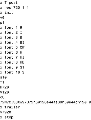 For example, suppose the following text is repeated many, many times in your document: .AL 1 .LI Log in as root. .LI Invoke the UNIX system administrative menu by typing \f(CWsysadm\fP and pressing Enter. .P The system administrative menu is displayed. .LI Select \f(CWEquine Systems\fP by highlighting the line and pressing Enter. .P The Equine Systems menu is displayed You could store this text in .Em (for Equine Menu) by prefacing it with .diEm and ending it with .di. Note that your diversion contains an unterminated list. If this is likely to cause problems, add .LE to the diverted text. To print the Equine Systems text, just put .Em in your file. In addition to .di, there is a .da (diversion append) primitive that works like .am. .da is used to add text to an existing diversion. It can be used over and over, each time adding more text to the diversion. To completely replace the text in a diversion, just define it again with a .diEm. The .am primitive can be used, like .am, to create Table of Content data. You can even have a diversion within a diversion. The "inside" diversion can be used on its own, as well. Trapstroff provides several kinds of traps: page traps (.wh and .ch); diversion traps (.dt); and input line traps (.it). Page traps usually invoke macros. For example, when troff gets near the bottom of a page, the trap that produces the page footer is sprung. A simple illustration of this is the following. Suppose you wanted to print the current date one inch from the bottom of every page in your document. Use the .wh primitive: .deDa \"define date macro \\n(mo/\\n(dy/18\\n(yr \"set date .. .wh 1i Da \"set the trap The order of the arguments is important. To remove this kind of trap, invoke it with the position, but without the macro name: .wh 1i. The .ch primitive changes a trap. If you wanted the date an inch from the bottom of the page on page 1 of your document, but an inch and a half from the bottom of the page on all subsequent pages, you could use .ch Da 1.5I, note that the argument order is different. Diversion traps are set with the .dt primitive, for example: .dt 1i Xx This diversion trap, set within the diversion, invokes the .Xx macro when (if) the diversion comes within one inch of the bottom of the page. Input text traps are set with the .it primitive. This trap is activated after a specified number of lines in your text file. There is a fourth kind of trap, though it is not usually thought of as a trap. This is the end macro (.em) primitive. .em is activated automatically at the end of your text file. It can be used to print overflow footnotes, Tables of Content, bibliographies, and so on. EnvironmentsThe .ev (environment) primitive gives you the ability to switch to a completely new and independent set of parameters, such as line length, point size, font, and so forth. It lets you return to your original set of parameters just as easily. This process is known as environment switching. The concept is used in page headers, for example, where the font and point size are always the same--and always different from the font and point size in the rest of the document. Three environments are available: ev 0 (the normal, or default, environment); ev 1; and ev 2. To switch from the normal environment, just enter .ev 1 or .ev 2 on a line by itself and specify the new parameters. These new parameters will be in effect until you specify a different environment. To return to your normal environment, use .ev or .ev 0. Listing 10.6 shows how you could use environment switching instead of writing the .Qb and .Qe macros. Listing 10.6. Using environments instead of .Qb and .Qe macros..ev 1 \"long quote begins .sp .ls 1 .in +1i .ll -2i text of quotation .sp .ev Environments are often used with diversions or with footnotes where the text is set in a smaller point size than body type. It is to accommodate diversions within diversions that the third environment is provided. DebuggingDebugging macros is a slow and often painful process. If you have a version of troff that includes a trace option, use it--but be warned: It produces miles of paper. If you do not have a trace option, you can use the .tm primitive (for terminal message) to print the value of a number register at certain points in your file. The value is sent to standard error, which is probably your screen. Use .tm like this: .tm Before calling the Xx macro, the value of xX is \n(xX. .Xx .tm After calling the Xx macro, the value of xX is \n(xX. You do not have hide the number register from copy mode because you put these lines right in your text file. You may want to delete these messages when the document is complete. The messages do not go to the printer but they can make your screen messy. troff OutputSometimes you have to look at troff output--it is not a pretty sight, but after the first few files, it begins to make sense. The troff code produced by a file with two words in it: UNIX Unleashed is shown in Figure 10.4. Figure 10.4. If you look hard, you can pick out the text in the long line. The numbers are horizontal motions reflecting the width of the letters. You can also see where the font positions are defined. The s10 on a line by itself is the point size. f1 is the font in position 1 (in this case, Times-Roman). The H and V numbers following the font definition specify the starting horizontal and vertical position on the page. PostScript OutputPostScript output is a little easier to read, but the set-up lines are endless. Where UNIX Unleashed generates 24 lines of troff code, the same two words generate more than 800 lines of PostScript code. The significant lines are at the beginning and the end. The last 17 lines of the PostScript produced by troff -Tpsc | psc of a file with two words in it: UNIX Unleashed is shown in Figure 10.5. Figure 10.5. Font and point size are specified as 10 R f (10 point Roman). Text is enclosed in parentheses (which makes it easy to find). The showpage is crucial. Every page in your d