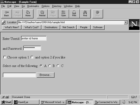 Listing 17.1 shows a typical sequence of field definitions and other HTML tags that might be used in a form. Listing 17.1. Field definitions for a form.<P> Enter Userid: <INPUT TYPE=text NAME="userid" VALUE="enter id here" SIZE=15 MAXLENGTH=15> <P> and Password: <INPUT TYPE=password NAME="passwd" VALUE="(required)" SIZE=10 MAXLENGTH=10> <P> <INPUT TYPE=checkbox NAME="option1" >Choose option 1 <INPUT TYPE=checkbox NAME="option2" > and option 2 if you like<BR> <P> <P> Select one of the following: <INPUT TYPE=radio VALUE="a" NAME="choice" CHECKED > A <INPUT TYPE=radio VALUE="b" NAME="choice" > B <INPUT TYPE=radio VALUE="c" NAME="choice" > C<BR> <P> <INPUT TYPE=file NAME="send-file" <INPUT TYPE=hidden NAME="user-state" VALUE="been here already"> These field definitions would result in the screen form shown in Figure 17.1. Figure 17.1 Several aspects of this form are worth noting at this point. First, notice the use of standard HTML scripting to assign labels to the text and password fields and to display a header for the checkbox and radio button lists. Second, notice that the browser (not the programmer) assigns the button label for file fields. This reminds us that HTML passes directives to the Web client (browser), but is not a text-formatting language. As with other tags, the screen results displayed by various browsers may differ when processing certain form-related tags. And finally, note that the hidden field does not appear on the screen. Advanced FormsAlthough INPUT is the basic field definition tag, client-side CGI offers a number of other interactive capabilities for advanced forms processing. SELECT and OPTIONThe SELECT and OPTION tags provide a way to define a menu of options and capture the user's selection. Although you could hard-code this functionality using checkboxes and radio buttons, the SELECT list provides a more sophisticated menu effect and saves considerable screen space if the selection list is long. As with the INPUT TYPE=file construct, different browsers may display a SELECT menu in somewhat different ways. All will, however, provide the user with a scrollable list of options from which to choose. As with other HTML tags, the <SELECT> tag must be paired with a closing </SELECT> tag. In addition to the attributes associated with the SELECT tag itself, the selection list is defined as a series of <OPTION> tags between the <SELECT> and </SELECT> pair. <SELECT> Attributes: