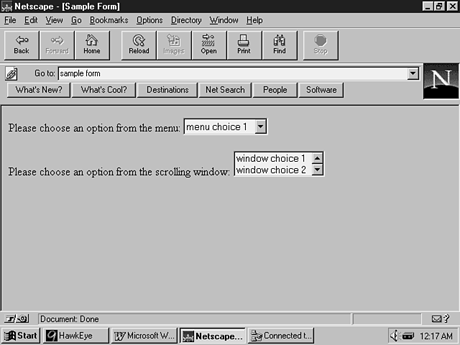 Listing 17.2 shows the definition of two SELECT lists. Listing 17.2. Defining SELECT lists.Please choose an option from the menu: <SELECT NAME="pulldown" SIZE=1> <OPTION>menu choice 1 <OPTION>menu choice 2 <OPTION>menu choice 3 </SELECT> <P> Please choose an option from the scrolling window: <SELECT NAME="scrolling" SIZE=2> <OPTION> window choice 1 <OPTION> window choice 2 <OPTION> window choice 3 </SELECT> <P> Figure 17.2 shows the resulting form display on the browser. Figure 17.2 TEXTAREAThe TEXTAREA tag is used to create a multiple-line field for free-form text entry. Web page designers often add a textarea field to collect user comments, e-mail to the web author, or similar unstructured information. As with SELECT, TEXTAREA requires a beginning and ending tag. Between these tags, and in addition to the attributes of the tag, the programmer can enter variable-length default text that will display when the textarea field is drawn on the screen. This text must be deleted by the user before he enters his own input. Attributes: