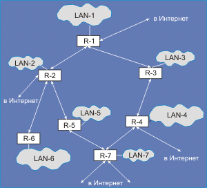 Каждая из сетей, составляющих Интернет, может быть реализована на разных принципах, это может быть Ethernet (наиболее популярное оборудование), Token Ring (вторая по популярности сеть), ISDN, X.25, FDDI или Arcnet. Все внешние связи локальной сети осуществляются через порты-маршрутизаторы (R). Если в локальной сети использованы сети с разными протоколами на физическом уровне, они объединяются через специальные шлюзы (например, Ethernet-Fast_Ethernet, Ethernet-Arcnet, Ethernet-FDDI и т.д.). Выбор топологии связей определяется многими факторами, не последнюю роль играет надежность. Использование современных динамических внешних протоколов маршрутизации, например BGP-4, позволяет автоматически переключаться на один из альтернативных маршрутов, если основной внешний канал отказал. Поэтому для обеспечения надежности желательно иметь не менее двух внешних связей. Сеть LAN-6 (см. рис. 1.3) при выходе из строя канала R2-R6 окажется изолированной, а узел LAN-7 останется в сети Интернет даже после отказа трех внешних каналов.