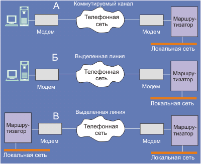 Использование выделенной 2- или 4-проводной линии (рис. 1.5Б) обеспечивает большую надежность и пропускную способность (до 256 кбит/с при длинах канала < 10 км). Но и здесь на каждый вход требуется отдельный модем, да и скоростные модемы, работающие на выделенную линию, относительно дороги. Выделенные линии чаще служат для межсетевого соединения (рис. 1.5В). Функциональным аналогом выделенных линий являются оптоволоконные, спутниковые и радио-релейные каналы. Этот вариант позволяет строить сети с пропускной способностью в несколько 1-100 Мбит/с и более.