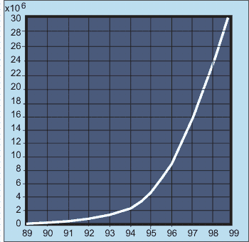 Рис. 1.1. Рост числа ЭВМ, подключенных к Интернет в период 1989-98 годы (по вертикальной оси отложено число ЭВМ в миллионах)