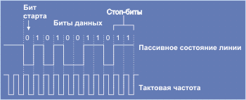Типичный кадр данных в асинхронном канале начинается со стартового бита, за которым следует 8 битов данных. Завершается такой кадр одним или двумя стоп-битами. Стартовый бит имеет полярность противоположную пассивному состоянию линии и переводит приемник в активное состояние. Пример передачи такого кадра показан на рис. 2.2.3.