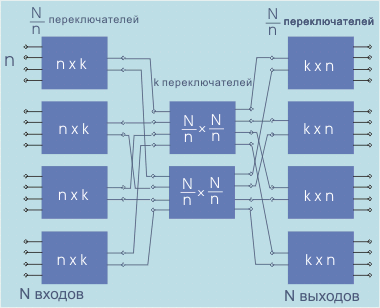 Первое слагаемое характеризует число элементарных переключателей во входной и выходной секциях системы, а второе - число элементарных переключателей в k внутренних модулях При N=1000, n=50 и k=10 требуется 24000 элементарных переключателей вместо миллиона (но и число одновременно формируемых каналов становится много меньше 1000).