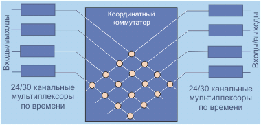 В традиционной телефонной сети для соединения с требуемым клиентом используются аппаратные коммутаторы. Если коммутатор имеет n входов и n выходов, то одновременно можно реализовать не более n связей. Реально это число всегда меньше и клиент слышит в трубке “короткие гудки” сигнала “занято”. В случае комбинирования традиционного коммутатора с m-канальными мультиплексорами пакетов по времени можно осуществить до m*n связей одновременно. При этом становится возможным объединить нескольких клиентов так, что они все одновременно могут говорить друг с другом. Схема такого переключателя каналов показана на рис. 2.2.8.