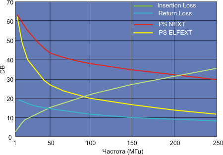 Рис. 3.1.6. Зависимость частотных свойст кабелей класса Е, а также NEXT, FEXT, Return Loss и Insertion Loss от частоты