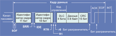 Однобитовое субполе SRR (substitute remote request) включено в поле арбитража (идентификатора кадра) и всегда содержит код 1, что гарантирует преимущество стандартного информационного кадра (2.0a) случае его соревнования с расширенным кадром (2.0b) (при равных 11 битах идентификатора). Субполе IDE (identifier extension) служит для идентификации расширенного формата и для этого типа кадра всегда имеет уровень логической 1. Вслед за IDE следует 18-битовое поле (биты имеют имена id-17, ..., id-0; первым передается бит id-28) расширения идентификатора кадра. Контроллеры 2.0b полностью совместимы с кадрами 2.0a и могут посылать и принимать пакеты обоих типов. Идентификаторы в пределах одной сети должны быть уникальными. Следует иметь в виду, что 18-битное поле расширения идентификатора можно при определенных условиях использовать и для передачи информации. Идентификатор не является адресом места назначения, а определяет назначение передаваемых данных (адресация по содержанию). По этой причине пакет может быть принят отдельным узлом, группой узлов, всеми узлами сети или не воспринят вообще. Предельное число различных идентификаторов для версии 2.0a составляет 2032, а для 2.0b превышает 500 миллионов.