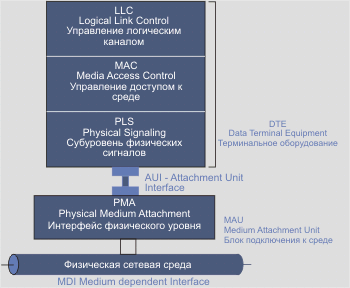 Алгоритм вычисления CRC сводится к вычислению остатка от деления кода M(x), характеризующего кадр, на образующий полином G(x) (Carrier Sense Multiple Access with Collision Detection (CSMA/CD) Access Method and Physical Layer Specification. Published by IEEE (802.3-1985). Wiley-Interscience, John & sons, inc.). CRC представляет собой дополнение полученного остатка R(x). CRC пересылается, начиная со старших разрядов. Схема взаимодействия различных субуровней при реализации протокола IEEE 802.3 показана на рис 4.1.1.1.2. Выше llc размещаются верхние субуровни, включая прикладной. Через AUI данные передаются с использованием манчестерского кода.