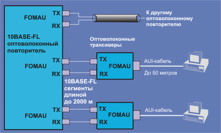 Рис. 4.1.1.1.9. Схема 10-мегагерцного оптоволоконного Ethernet (для 100 Мбит/с схема с минимальными модификациями аналогична).