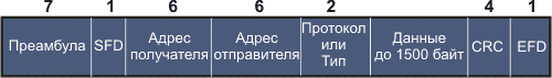 Рис. 4.1.1.1.1 Формат кадра сетей ethernet (цифры в верхней части рисунка показывают размер поля в байтах)