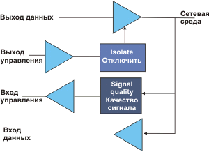 При передаче сигнал распространяется в обоих направлениях по кабелю от точки подключения интерфейса. При использовании тонкого кабеля интерфейс должен иметь максимально большое входное сопротивление и минимально возможную входную емкость, чтобы вносить минимальные искажения для сигналов, распространяющихся по сегменту. В случае работы со скрученными парами на "кабельный сегмент" подключается только один интерфейс. Максимальное время прохождения сигнала между узлами сети, принадлежащих одному сегменту, называется окном коллизий и является важной рабочей характеристикой.