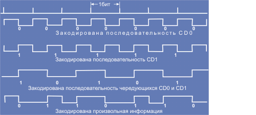 Манчестерский код объединяет в бит-сигнале данные и синхронизацию. Каждый бит-символ делится на две части, причем вторая часть всегда является инверсной по отношению первой. В первой половине кодируемый сигнал представлен в логически дополнительном виде, а во второй - в обычном. Таким образом, сигнал логического 0 - CD0 характеризуется в первой половине уровнем HI, а во второй LO. Соответственно сигнал CD1 характеризуется в первой половине бит-символа уровнем LO, а во второй - HI. Примеры форм сигналов при манчестерском кодировании представлены на рис. 4.1.1.1.3.