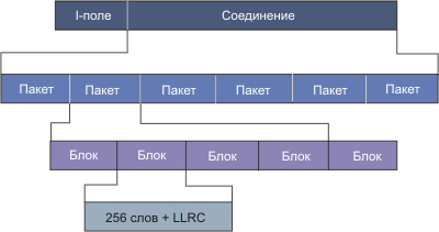 HIPPI предполагает передачу данных по медному кабелю (или оптическому волокну) только в одном направлении по схеме связи точка-точка, но два канала HIPPI могут обеспечить и двунаправленный обмен данными. Передающий кабель может содержать 50/100 скрученных пар или соответствующее число оптических волокон. Длина пакета данных может варьироваться. Протокол HIPPI рассчитан на работу в реальном масштабе времени при суммарных длинах кабелей до десятков километров. Стандартный блок данных содержит 256 слов (1024 или 2048 байт). Для контроля корректности передачи предусмотрен контроль по четности для каждого байта на шине, кроме того, для каждого блока данных вычисляется “продольная” контрольная сумма (LLRC - length/longitudinal redundancy checkword). На рис. 4.1.7.2 показана схема передачи данных в рамках протокола HIPPI. На каждое соединение может быть передано любое число пакетов, пакет в свою очередь может содержать любое число блоков. Время между пакетами не регламентировано и может меняться, оно зависит от потока данных и протокола верхнего уровня.