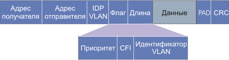 Поле идентификатор протокола VLAN (IDP VLAN) имеет длину два байта и содержит код 0х8100. Поскольку это число больше 1500, сетевые карты Ethernet будут интерпретировать его как тип, а не как длину. Как будет реагировать карта, неподдерживающая 802.1Q, получив такой кадр, сказать трудно. По этой причине это следует по возможности исключить. Структура полей флаг и длина представлена в нижней части рисунка. Поле идентификатор VLAN имеет длину 12 бит определяет, какой виртуальной сети принадлежит кадр. Поле приоритет (три бита) позволяет выделять трафик реального времени, трафик со средними требованиями и трафик, для которого время доставки не критично. Это открывает возможность использования Ethernet для задач управления и обеспечения качества обслуживания при транспортировке мультимедийных данных. Однобитовое поле CFI (Canonical Format Indicator) первоначально определял, прямой или обратный порядок байт используется. В настоящее время его функцией (=1) является указание того, что в поле данных содержится кадр 802.5.