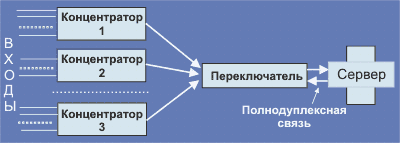 Все входы/выходы повторителя с точки зрения пакетов эквивалентны. Если повторитель многовходовый, то пакет пришедший по любому из входов будет ретранслирован на все остальные входы/выходы повторителя. Чем больше кабельных сегментов объединено повторителями, тем больше загрузка всех сегментов. При объединении нескольких сегментов с помощью повторителя загрузка каждого из них становится равной сумме всех загрузок до объединения. Это справедливо как для коаксиальных кабельных сегментов, так и для повторителей, работающих со скрученными парами (хабы - концентраторы). Некоторые повторители контролируют наличие связи между портом и узлом (link status), регистрируют коллизии и затянувшиеся передачи (jabber - узел осуществляет передачу дольше, чем это предусмотрено протоколом), выполняют согласование типа соединения (autonegotiation). В этом случае они обычно снабжены SNMP-поддержкой.