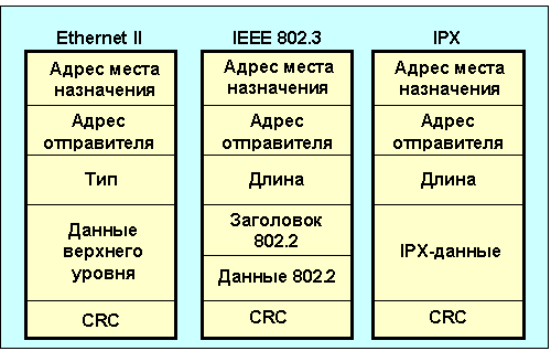 Из рисунка видно, что различия непринципиальны и не препятствуют сосуществованию всех перечисленных форматов в пределах одной локальной сети. IPX-заголовок начинается сразу после поля Тип или Длина в зависимости от используемого протокола.