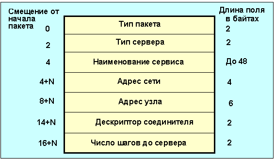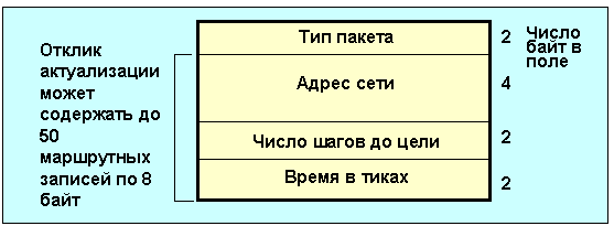 Поле тип пакета содержит код 0x0001, если это запрос, и 0x0002, если отклик. В поле адреса сети записывается адрес сети места назначения, если пакет является запросом. Если в поле записан код 0xff ff ff ff, это означает, что запрос относится ко всем известным сетям. Поле число шагов до цели имеет смысл лишь в случае пакетов-откликов. В этом случае сюда заносится число маршрутизаторов, которые должен пройти пакет по дороге к сети назначения. Поле время в тиках имеет смысл для пакетов-откликов и указывает на время, необходимое для достижения сети адресата. Один тик равен 1/18 секунды. Сходный протокол маршрутизации используется в сетях appletalk (RTMP).