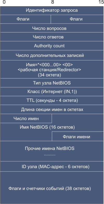 WINS-запросы обычно транспортируются в UDP-дейтограммах. При этом используется порт отправителя=137. В поле данных размешается 2-октетное поле идентификатора, позволяющего связать запрос с откликом. Далее следует 2 байта флагов, в случае запроса туда записывается 0. За ним размещается два октета, содержащие число вопросов, 2 октета числа ответов и еще 4 нулевых октетов. Завершается кадр запроса двумя октетами поля типа (00 21 -> статус узла NetBIOS) и полем класса (для Интернет 00 01 -> (IN,1)). Такие запросы позволяют получить дополнительные данные (имя узла, его MAC-адрес, NetBIOS-имя, имя группы) об ЭВМ с заданным IP-адресом. Причем эта ЭВМ может находиться где угодно в Интернет, но непременно работать в OS Windows. Формат поля данных UDP-дейтограммы запроса показан на рис. 1.