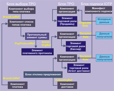 | Торговый блок | Торговый блок состоит из одного или более торговых компронент. Один или более торговых блоков может содержаться в IOTP-сообщениях, которые пересылаются в форме XML-документов от одной торговой роли к другой. Сущетсвует три типа торговых блоков: o блок Exchange или o блок Response | |