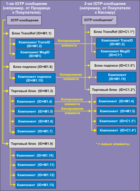 | Сообщение IOTP | Сообщение IOTP является самой внешней структурой, в которую помещаются документы, которыми обмениваются торговые роли, принимающие участие в сделке. Это хорошо сформатированный XML-документ. Документы, которые содержат сообщение, состоят из: o опционный блок Signature, который служит для цифровой подписи торговых блоков или компонентов, связанных с транзакцией IOTP; o опционный блок Error для уведомления о технических ошибках, содержащихся в предыдущем полученном сообщении IOTP и o последовательность торговых блоков IOTP, которые несут данные, необходимые для выполнения транзакции. | |