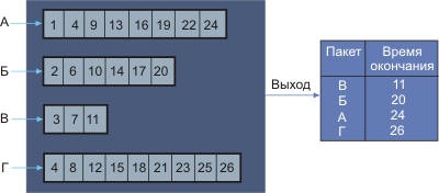 Рис. 4.8. Маршрутизатор с 4-мя входными каналами, в каждом из которых ждет очереди передачи по одному пакету. В правой части рисунка представлен порядок посылки этих пакетов.