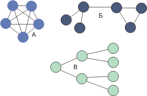 Вариант А на рис. 4.2 представляет собой схему с полным набором связей (все узлы соединены со всеми), такая схема используется только в случае, когда необходимо обеспечить высокую надежность соединений. Эта версия требует для каждого из узлов наличия n-1 интерфейсов при полном числе узлов n. Вариант Б является примером нерегулярной топологии, а вариант В - иерархический случай связи (древовидная топология).