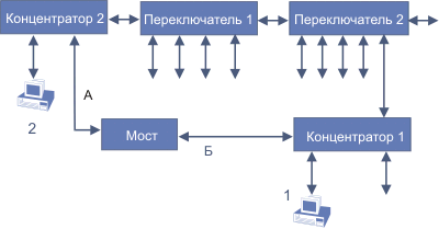 Пакеты от машины 1 через концентратор 1 и 2 попадут в концентратор 2, эти же пакеты попадут туда через мост. В результате возникнет встречное кольцевое движение идентичных пакетов. Кроме того, переключатели и мост попытаются разобраться с этим безобразием и начнут посылать широковешательные пакеты, чтобы выяснить с каким из портов на самом деле связаны эти ЭВМ. Они от рождения убеждены, что одна и та же ЭВМ может быть доступна только через один порт. Таким образом, всплески загрузки сети, особенно широковещательной, должны привлекать внимание администратора. В данном примере, если система переключателей и мостов не поддерживает алгоритма “расширяющееся дерево”, администратор сам должен разорвать эту кольцевую структуру.