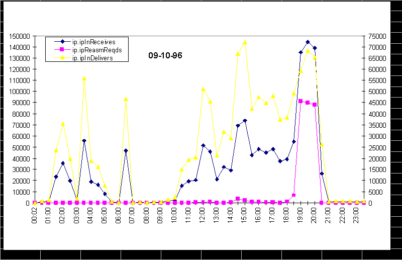 По горизонтальной оси отложено время от начала суток. Кривая, отмеченная треугольниками, соответствует правой шкале диаграммы, это справедливо для всех последующих рисунков. Входной и выходной потоки через данный интерфейс практически равны. На рис. 5.1.4(а,б) показана вариация со временем входных потоков IP-дейтограмм (ipinreceives, ipinreasmreqd и ipindelivers). Пик в правой части рис. 5.1.4а (19:00 - 20:00) показывает, что поток ipinreceives превосходит поток ipindelivers почти в два раза. Можно было бы предположить, что разница определяется числом ошибок, но так как по времени это совпадает с пиком в диаграмме ipinreasmreqd, различие следует интерпретировать, как необходимость сборки сообщений. Сопоставление значений ipinreceives, ipinreasmreqd и ipindelivers подтверждает такое предположение. Если такого рода ситуация в сети повторяется часто, нужно просмотреть корректность выбора mtu для объектов, участвующих в данном обмене. Для областей вне указанного пика значения ipinreceives и ipindelivers почти совпадают, что говорит о низком уровне ошибок (это подтверждается и значением потока icmpouterrors, icmpoutdestunreachs и ifinunknownprotos.