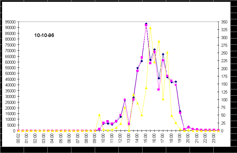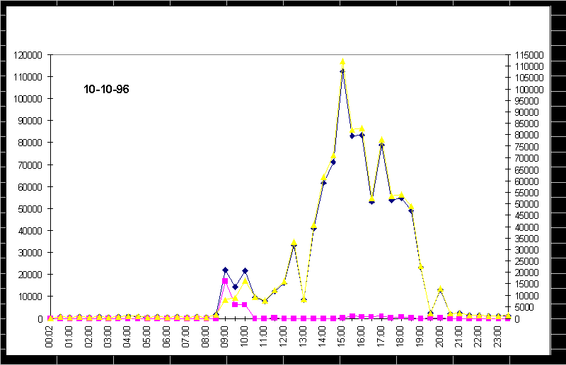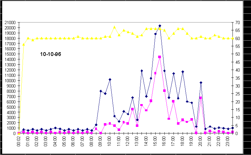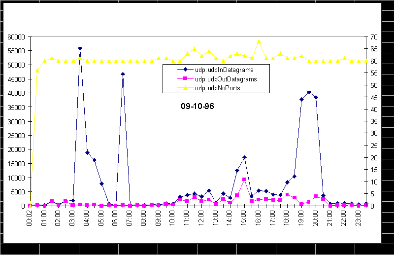 Для защищенных систем доступ к snmp-резиденту в пакетах должно использоваться поле community = паролю. Но даже эта мера не может блокировать вторжение со стороны LAN, так как в результате перехвата snmp-пакетов пароль может быть открыт. При написании таких программ нужно учитывать версии MIB, используемые анализируемыми узлами, а также тот факт, что snmp-отклики могут иметь для разных операционных сред. Рассмотрим, как варьируются некоторые из перечисленных переменных в течении суток и недели. На рис. 4.1.2 видны спады сетевой активности в ночное время и в выходные дни. Левый край диаграммы соответствует понедельнику 9 сентября (ночь), правый - понедельнику, но уже следующей недели. На рис. 4.1.3 приведена диаграмма вариации некоторых переменных за сутки. Сетевая активность захватывает период от 10 часов утра и спадает почти до нуля к 9-10 вечера, хотя бывают и исключения. Для эффективной интерпретации временных зависимостей можно использовать программу мониторинга last (или любой ее эквивалент), которая позволяет отслеживать появление новых пользователей или процессов (например, ftp). Фрагмент распечатки, выданной программой last на ЭВМ, snmp-резидентом которой пользовалась наша программа, приведен ниже.