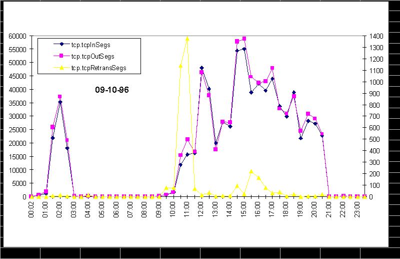 Рассмотрим средние значения некоторых переменных за сутки. Так переменные ip.ipinreceives=1379552, ifentryifinucastpkts=1278232, ifentry.ifinnunicastpkts=5083 характеризуют средний поток пакетов на входе сетевого интерфейса. Видно, что широковещательные и мультикастинг-пакеты составляют малую долю потока, что и следует ожидать. Большой поток пакетов типа nonunicast обычно говорит о неисправности в сети. Величины ifentry.ifoutunicastpkts=1369809 и ifentry.ifoutnunicastpkts=90 характеризуют выходной поток пакетов, соотношение обычных и nonunicast-пакетов и здесь нормально. Сравнимое их значение говорило бы о неисправности сетевого интерфейса данной ЭВМ или о порче сетевого программного драйвера. Блок переменных ip.ipinhdrerrors=8, icmp.icmpouterrors=45, icmp.icmpoutdestunreachs=22 и ifentry.ifinunknownprotos=81 указывает на число сбоев в сети, если соотнести эти цифры с входным и выходным потоками пакетов можно сделать вывод о благополучии в данном кабельном сегменте, во всяком случае на протяжении данных суток. Такие ошибки возможны из-за всплеска шумов или наводок (например, по сети переменного тока). Определенное беспокойство может вызвать значение icmpoutdestunreachs, но это может быть результат работы программы ping или traceroute для недоступного узла или опечатка в IP-адресе. Переменная icmp.icmpinsrcquenchs=19 весьма важна, так как она отмечает случаи перегрузки. В данном случае таких ситуаций за сутки случилось мало. Отслеживая эту переменную для разных ЭВМ, можно выявить слабые элементы в сети и скорректировать их параметры (например, увеличить буферную память). Переменные tcp.tcpinsegs=762696, tcp.tcpoutsegs=803676 и tcp.tcpretranssegs=3554 говорят о потоках tcp-пакетов (главного транспортного средства Интернет). Число tcpretranssegs характеризует надежность и правильность настойки параметров сети, чем меньше это число, тем лучше. udp.udpindatagrams=378119, udp.udpoutdatagrams=59429 указывают на входной и выходной потоки UDP-дейтограмм (сравните с потоками TCP-сегментов). Запись в MIB udp.udpnoports является важным диагностическим показателем. Переменные, регистрирующие число тех или иных ошибок, неупомянутые в этом абзаце, оказались равными нулю. Количество пакетов snmp в точности совпадает с их числом, посланным и полученным данной программой-тестером, что говорит об отсутствии какой-либо другой SNMP-активности. Контролировать это время от времени также полезно из соображений сетевой безопасности.