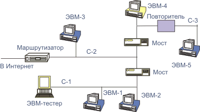 Для диагностики сегмента, непосредственно связанного с ЭВМ-тестером, можно использовать режим 6 Ethernet-интерфейса ЭВМ-тестера. Этот режим, при котором принимаются все пакеты, следующие по сегменту, позволяет регистрировать распределение пакетов по адресам отправителя и получателя, протоколам, длинам пакетов и т.д.. Запуская определенные программы на ЭВМ 1 или 2 (сегмент С-1), можно получить исчерпывающую информацию о состоянии сегмента. Этот способ диагностики не пригоден для сегментов, к которым подключены ЭВМ 3 (сегмент С-2), 4 и 5 (сегмент С-3). В случае, если все ЭВМ сети поддерживают протокол tcp/ip, возможно применение для целей диагностики протокола icmp (RFC-1256, -1788, -1885, -792). Этот протокол также как и snmp пригоден для диагностики не только локальной сети но и каналов Интернет. Если использовать icmp не только для трассировки маршрутов, но и для измерения процента испорченных пакетов, можно получить весьма полезную информацию, а при длинных сегментах зарегистрировать ухудшение качества сегмента при подключении слишком большого числа ЭВМ. Такая техника может прогнозировать ухудшение пропускной способности канала при подключении дополнительных ЭВМ. Но применение icmp ограничено ЭВМ, поддерживающими протоколы Интернет, да и получаемые данные весьма ограничены.