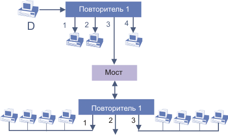 Пусть диагностическая ЭВМ занимает положение в сети, помеченное буквой D. Сканирующая программа, позволяя проверить доступность любой из ЭВМ, может выявить неисправный вход/выход любого из повторителей, хотя сами эти приборы пассивны и на пакеты ICMP откликов не присылают. Это определяется по наличию или отсутствию отклика от хотя бы одной ЭВМ, подключенной к исследуемому входу/выходу. Так, если ни одна ЭВМ сегмента Б не откликается, то можно сделать вывод, что выход 3 повторителя 2 не исправен (предполагается, что хотя бы одна машина сегмента Б включена). Аналогичным образом можно проверить выходы повторителя 1. Если же не откликаются ЭВМ сегментов А и Б, то весьма вероятен отказ моста. Если же ни одна из ЭВМ, показанных на рисунке, не присылает отклика, а известно, что они включены, то не исправен повторитель 1. Конечно, эту задачу можно решить и с помощью стандартной программы PING, но это займет много больше времени. Администраторы, обслуживающие многомашинные сети, размещенные во многих зданиям, безусловно оценят преимущества сканирующей программы.