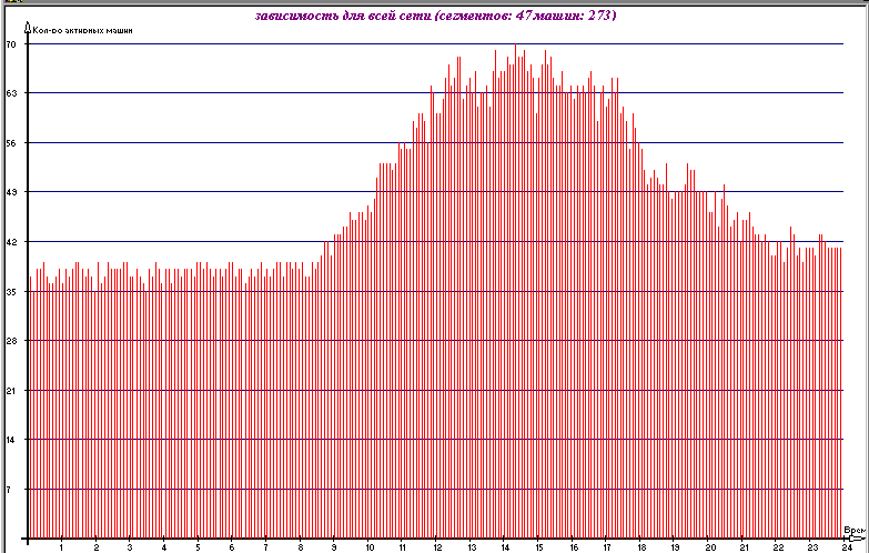 Ниже на рисунке 5.2.3 показан результат круглосуточного мониторинга в сети ГНЦ ИТЭФ. Программа позволяет не только отображать такого рода диаграммы но и измеряет относительные потери для различных сегментов сети (написана Сергеем Тимохиным). Предусмотрена возможность вывода списка машин активных в любой заданный интервал времени. По горизонтали отложено время суток 0-24 часа, а по вертикали - число ЭВМ, присылающих отклики на icmp-запросы. Нетрудно видеть, что днем активных ЭВМ больше, чем ночью. :-)
