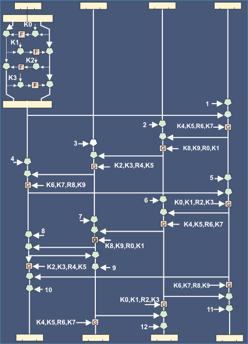 Первая группа бит исходного текста подвергается шифрованию с использованием G-перестановок (четырех цикличный шифр Файстела - специальный класс блочных шифров, где зашифрованный текст получается из исходного путем многократного использования одного и того же преобразования, напоминает шифр DES. Исходный текст разделяется на две части. Функция преобразования f и ключ используются для преобразования одной из половин а результат объединяется со второй частью исходного кода с помощью операции исключающее ИЛИ. После этого части меняются местами и процедура повторяется и т.д.). Для полученного результата и номера цикла (RN = 1-32) и четвертой группы исходного текста (W4) выполняется операция XOR. После этого производится перенос: W1 -> W2; W2 -> W3; W3 -> W4; W4 -> W1.