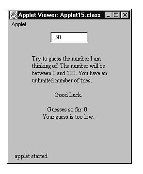 When you run Applet15, the program selects a random numeral from 1 to 100. Your task is to guess the numeral in the least number of tries. You type your guesses into the box at the top of the applet. When the program starts, this box contains the number 50, and the hint at the bottom of the screen tells you whether the number is high or low. Each time you enter a new number, the hint tells you whether the guess is high or low.
