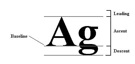 If you haven't used fonts before, some of the terms-leading, ascent, and descent-used in Table 17.2 may be unfamiliar to you. Leading (pronounced "ledding") is the amount of white space between lines of text. Ascent is the height of a character, from the baseline to the top of the character. Descent is the size of the area that accommodates the descending portions of letters, such as the tail on a lowercase g. Height is the sum of ascent, descent, and leading. See Figure 17.3 for examples of each. |