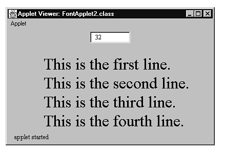 When you run FontApplet2, you see the window shown in Figure 17.5. The size of the active font is shown in the text box at the top of the applet, and a sample of the font appears below the text box. To change the size of the font, type a new value into the text box and press Enter. Figure 17.6, for example, shows the applet displaying 12-point font, whereas Figure 17.7 is the applet displaying 120-point characters. As you can see, no matter what font size you choose, the lines are properly spaced (although large fonts overrun the boundaries of the applet's canvas).
