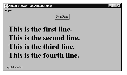 You wouldn't create a font unless you had some text to display. The problem is that before you can display your text, you need to know at least the height of the font. Failure to consider the font's height may give you text lines that overlap or that are spaced too far apart. You can use the height returned from the FontMetrics class's getHeight() method as a row increment value for each line of text you need to print. Listing 17.5, which is the source code for the FontApplet2 applet, shows how this is done. Listing 17.6 is the applet's HTML document, and Figure 17.5 shows what the applet looks like.