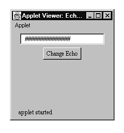 Listing 19.6 is the source code for a short applet called EchoApplet that initializes a textfield object to use an asterisk as an echo character. Listing 19.7 is the applet's HTML document. When you run the applet and type something in the textfield control, you see the display in Figure 19.7. You can change the echo character by clicking on the Change Echo button. Then, when you click on the textfield control to enter text, the text in the control changes to the new echo character, as shown in Figure 19.8. The program switches between three different echo characters: an asterisk (*), a pound sign (#), and a dollar sign ($).
