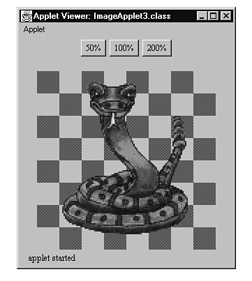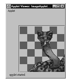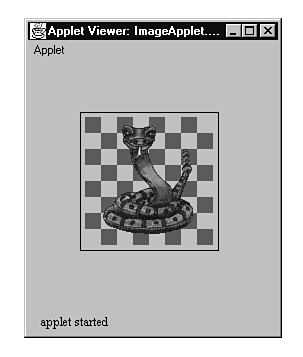 You're now ready to write an applet that can display images. Listing 27.1 is the Java source code for an applet called ImageApplet that displays a small image using the techniques described previously in this chapter. When you run the applet with Appletviewer, you see the window shown in Figure 27.1. Make sure the SNAKE.gif image is in the same directory as the ImageApplet.class file, since that's where the program expects to find it.