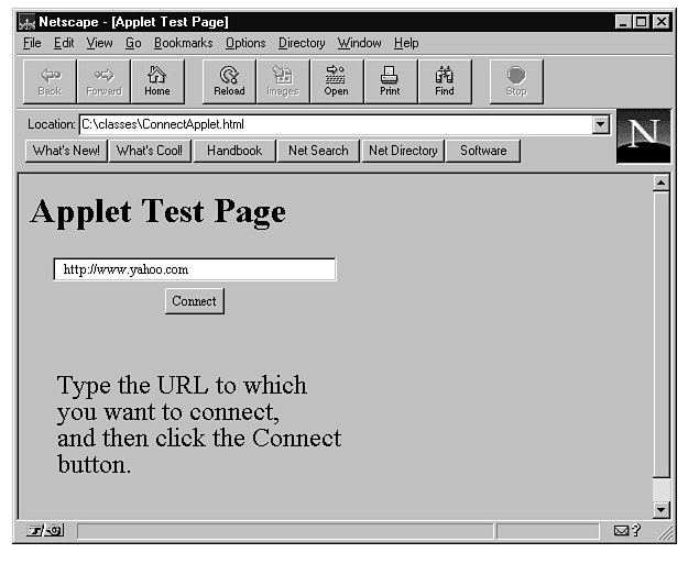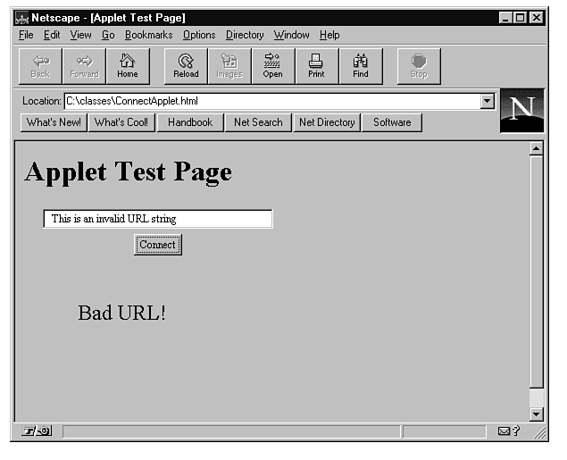 You can load ConnectApplet's HTML file using Appletviewer, if you like. However, you will be unable to make a connection to the requested URL. You can, however, see what happens when you enter a badly constructed URL string. |
