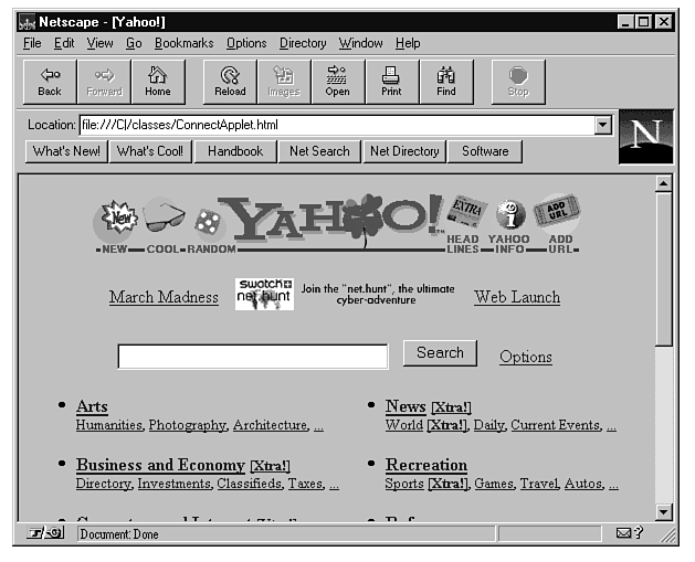 Ready for a full-fledged example? Listing 28.3 is a complete applet that enables the user to link to an URL. Listing 28.4 is the HTML document that loads the applet. Because this applet actually interacts with a browser and the Internet, you must have made your Internet connection before running the applet. Then, to run the applet, load its HTML document into a Java-compatible browser such as Netscape Navigator 2.0. When you do, you'll see a window similar to that shown in Figure 28.1. In this figure, the user has already entered the URL he wishes to visit. In Figure 28.2, the browser has made the requested connection. Figure 28.3 shows the browser when the user enters an invalid URL string.