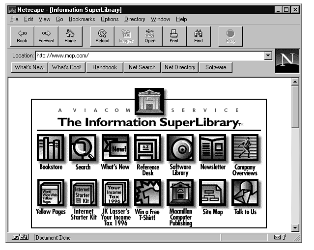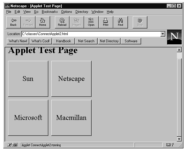 When you run the applet from Netscape Navigator 2.0, you see the window shown in Figure 28.4. As you can see, the applet currently displays four buttons, one each for the Sun, Netscape, Microsoft, and Macmillan Web sites. Just click a button to jump to the associated site. (Figure 28.5 shows the browser after the user has clicked the Macmillan button.) When you're through with that site, use the browser's Back button to return to the ConnectApplet2 applet. Then, choose another site.